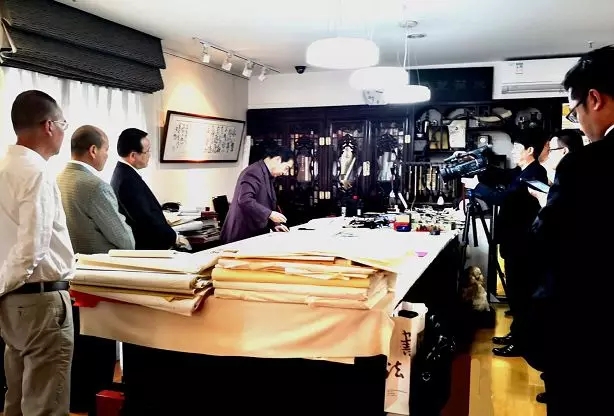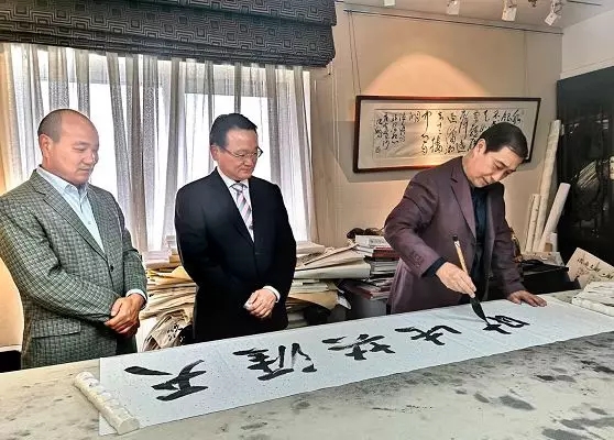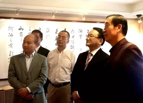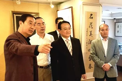 陈柏光主席一行在丁谦先生的引导下,观看了丁谦书法工作室陈列的当代书画名家的作品和丁谦先生的一些代表书作。丁谦先生介绍了自己的一些重点作品在创作过程中的想法、感受和体会,陈柏光主席耐心细致地听着讲解,并连连点头称赞。