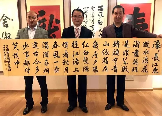 应陈柏光主席之邀,丁谦先生书写了“坦诚春秋”、"天涯共此时",并题写了"守道同行,共创华章"、“海纳百川,崇德尚和,敬事自信,锐意精进”。最后,丁谦先生还应邀书写了三国演义开篇词杨慎的“临江仙 滚滚长江东逝水”。另外,丁谦先生分别向其他来宾也赠送了书法作品。