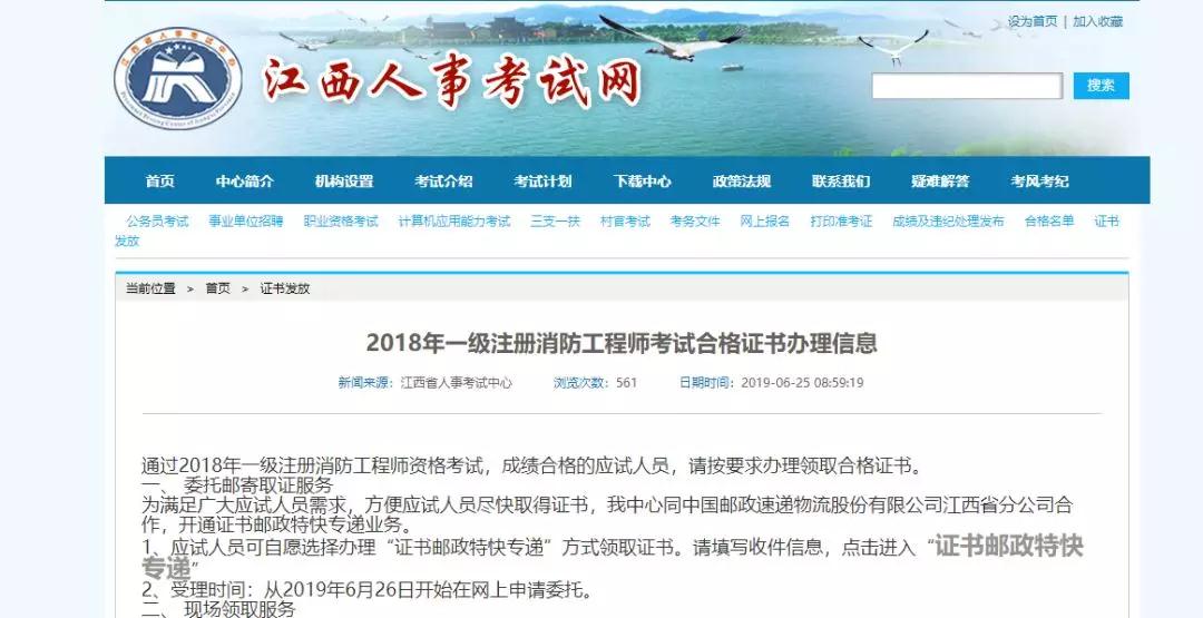 关于领取江西地区 2018 年度一级注册消防工程师证书