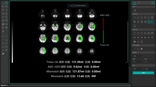 NeuBrainCare是东软医疗针对脑卒中多模态影像学检查需求,自主研发的人工智能定量分析软件(注:该软件正在注册中),可对核心梗死区、异常灌注区和缺血半暗带进行自动标注、计算、统计,并可辅助医生进行风险评估、选择治疗路径等,其功能目前已达到国际同等水平。