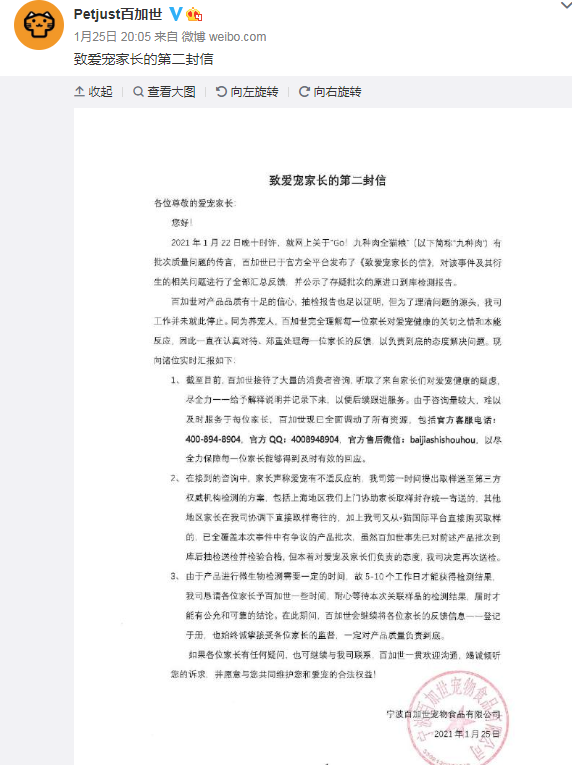 据调查,本舆论话题于2021年1月21日开始持续发酵,随后,百加世公司分别于1月22日、1月25日先后两次通过其官方微博发表《致爱宠家长的信》,就该事件的起因、调查进度、产品质量安全问题等做出了回应。同时百加世公司在发布的信息中表示,已从消费者处取样网传存疑批次的产品,进行第三方送检,并恳请消费者给予耐心,等待检测报告结果。