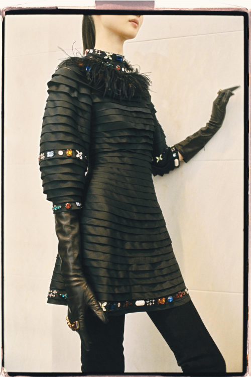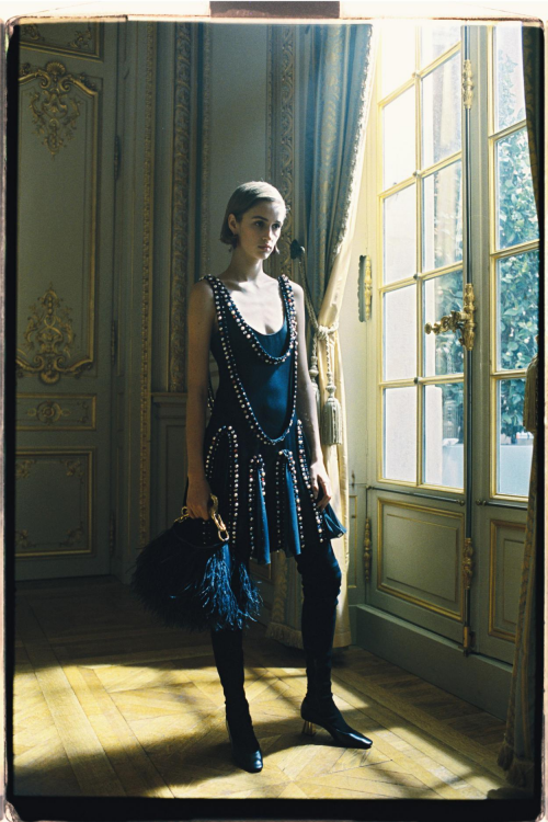 延续与品牌创始人Jeanne Lanvin女士间的对话,本季的设计依旧从品牌典藏中汲取元素,但这些元素又以一种抽象又理想化的形式呈现。Jeanne Lanvin女士所设计的“珠宝”礼服裙——将流线型晚礼服与精致宝石融为一体——被重新演绎成短款鸡尾酒裙,更添活力与律动感。其他裙装款式由罗纹缎带缠绕而成,上面绣有星群图案(源自Jeanne Lanvin女士1924年的设计蓝本),或饰有缎面蝴蝶结,以礼赞女性力量。深受美妆或香水创意的启发,柔美浅色系的鸵鸟毛,点缀以抢眼的蜜粉红、粉蓝色和炽烈的唇红色,营造出一朵柔软的“糖果云”。LANVIN的品牌标识以金色演绎,象征着荣耀的徽章,巧妙跃于手袋、鞋跟之上。此系列是对创始人Jeanne Lanvin女士和其女儿Marguerite的致敬——形如花朵的珠宝设计,也正映射了其女儿Marguerite(法文译为雏菊花)的名字。