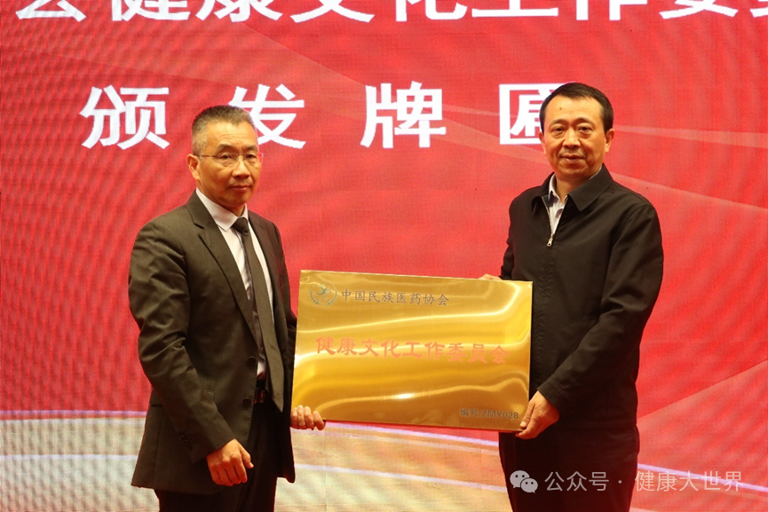 在热烈的掌声中,中国民族医药协会健康文化工作委员会新当选的会长王忠从田联刚常务副会长手中接过匾牌。