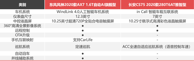 2020款AX7和2020款CS75,均属各自品牌的旗舰SUV作品,无论市场表现还是消费者口碑都很出色。通过以上两款价格相同的车型对比,它们动力相当、车身尺寸相近、车机性能优秀,不过2020款AX7拥有更多越级的配置,再加上10年不限里程的质保政策,以及刚刚升级WindLink4.0人工智能车机系统所赠送的VIP会员及不限流量的福利,使得它在12万+的可选区间里,性价比更为突出,要知道东风风神刚刚荣获了J.D.Power 2019中国车辆可靠性研究SM(VDS)自主品牌第二名的好成绩,有着好品质再加上年轻、时尚的外观和电子换挡等精致内饰,当然值得计划购车的年轻人,尤其是追求超酷型格的消费者,走进4S店一试高下,再做决定。