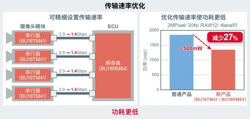 普通的SerDes IC为每个频段设置了固定的传输速率。然而,由于这种方式无法更精细地设置传输速率,因此会产生功率损耗。而“BU18xMxx-C”则配备了根据分辨率而不是频段来优化传输速率的功能。由于可以进行比普通产品更精细的传输速率设置,因此工作效率更高,有助于进一步降低车载摄像头模块的功耗。在将本产品安装在使用四个摄像头模块的应用产品中时,与普通产品相比,上述优势可以将功耗降低约27%。
