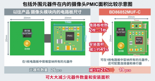 CMOS图像传感器是车载摄像头的主要器件,制造商不同,其驱动电压设置和时序控制也不同,并且需要使用很多外置部件构成。“BD86852MUF-C”配备了可设置主要CMOS图像传感器的驱动电压和时序控制的引脚,从而无需驱动电压设置和时序控制用的外置部件。因此,与以往产品相比,部件数量和安装面积显著减少,这将有助于车载摄像头模块的小型化。