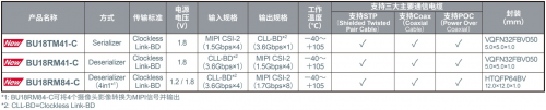 本产品共有3个产品型号,其中包括一款串行器和两款解串器产品。由于三款产品都支持三大主要通信电缆,因此可支持各种CMOS图像传感器和SoC。