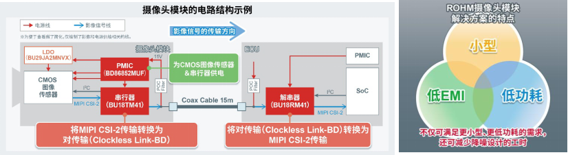 ROHM通过组合SerDes IC和摄像头用PMIC的新产品,来解决这些问题。此外,由于两种产品都具有展频功能,因此EMI更低,而EMI对策一直是车载应用设计中的一个主要负担,这将有助于减少EMI对策的设计工时。