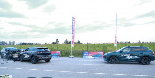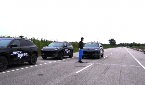 除了测试AEB系统对行人的制动效果,现场更在双车对碰--测试AEB制动环节,展现了系统对车辆的制动效果。在实际测试中,两辆风行T5 EVO以100km/h的相对速度高速对撞,而第三辆风行T5 EVO通过ACC自适应巡航功能跟随一辆前车正常行驶,当遇到前车突然发生碰撞事故时,第三辆风行T5 EVO表现出了优异的AEB自动紧急制动性能,通过监测前方目标的距离和相对速度采取制动,避免了与前车追尾事故的发生。