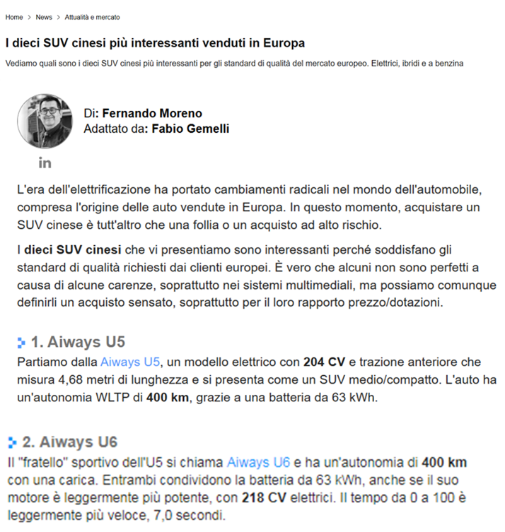 对于此次评选出来的最畅销SUV车型,《Motor1》在报道中表示:“我们评选的这十款中国SUV,完全符合欧洲用户要求的质量标准,且综合价格、性能等多方面表现来看,这些车均是值得我们购买的高品质车型。”作为美国知名权威汽车媒体,《Motor1》目前有10种语言13个国家的版本,涵盖全球43亿用户,提供包括新闻、排名、试驾等汽车相关最新资讯,在全球具备广泛影响力。该网站每季度会将试驾的车型根据设计、舒适、配置、性能、安全、燃油经济性、售价等维度做成TOP10的榜单排名,其评选维度更为全面和客观。《Motor1》对爱驰、比亚迪等中国车型的认可,也从侧面印证了中国汽车尤其是中国新能源汽车品牌在国际上的地位已经今非昔比,尤其是以爱驰为代表的“中系车”在欧美市场已经具备一定的影响力。