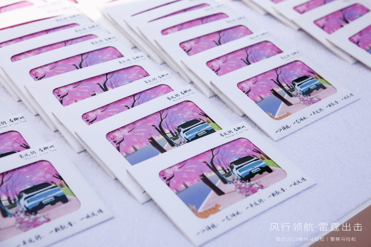 在马拉松开跑之前,东风风行提前行动,举办柳州马拉松博览会。大家可以到博览会详细了解此次柳马活动,现场更有风行雷霆供大家零距离体验,还可免费领柳州城市明信片!此次东风风行准备的明信片,以彩绘的形式,将柳州的紫荆花海、螺狮粉等元素和风行雷霆有机地融合在了一起,粉色鲜花配上淡蓝高颜值车辆,别有一番韵味。