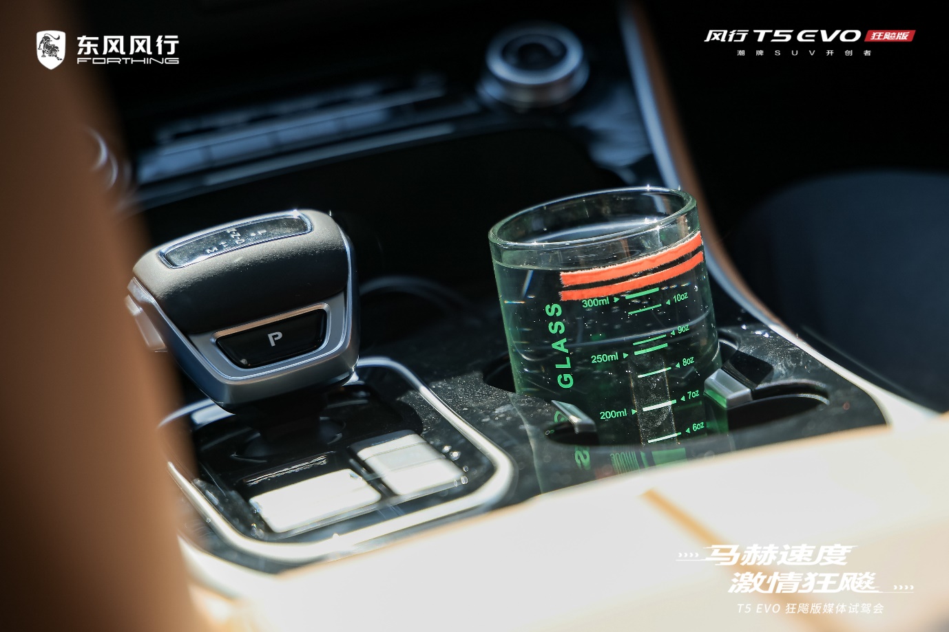 在“竞速PK”中,各位试驾人员将在规划了各种弯道和直道的试车赛道上刷圈竞速,在“洒水挑战”中,大家的驾驶座舱内放置有刻度水杯的车辆,在不低于40km/h的时速下完成绕桩行驶,根据洒水量的多少计算成绩。这两个环节对车辆的底盘、悬架、转向等系统都有着极为苛刻的要求,难度相比“麋鹿测试”只高不低。风行T5 EVO狂飚版在测试中凭借着强大的底盘调校功底和ADAS的辅助,车身姿态与指向一直都能被牢牢地控制在驾驶员手中,从车内水杯的稳定性上来看,在连续急弯中风行T5 EVO狂飚版的横向姿态一直都较为平稳,强大的侧向支撑力更是降低了人们对弯道的恐惧感。