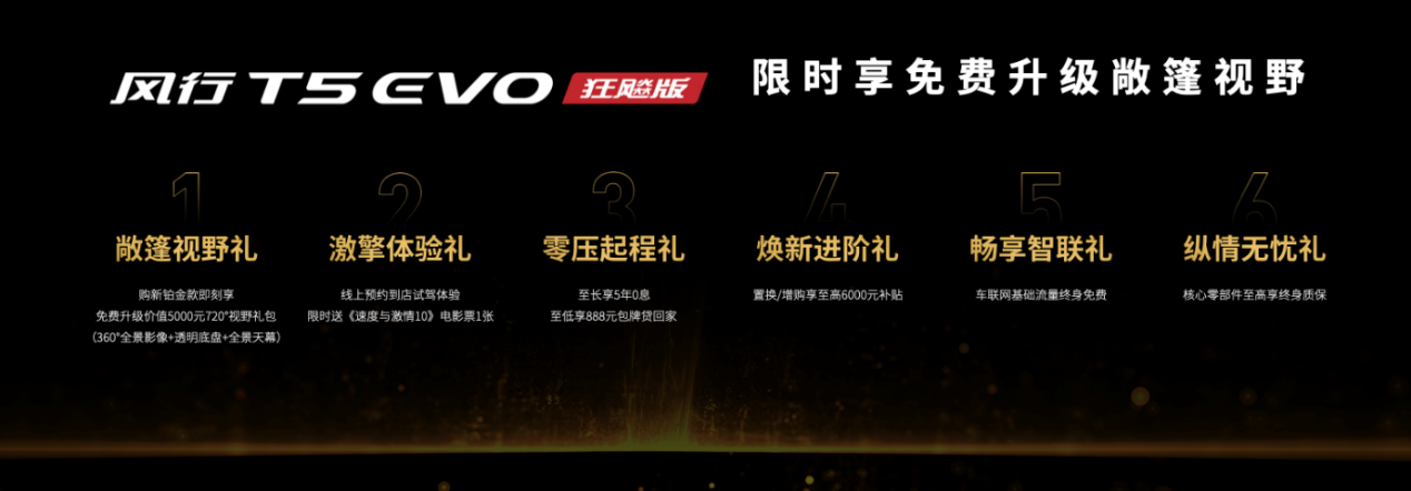 除此之外,风行T5 EVO狂飚版更有令人心动的福利政策。限时送《速度与激情10》电影票,只要线上预约到店试驾体验即可领取,绝对是最纯粹的福利,同时购新铂金款即刻享免费升级价值5000元720°视野礼包,“零压起程礼“可至长享5年0息,至低享888元包牌贷回家,“焕新进阶礼”可享置换或增购至高6000元补贴,还有车联网基础流量终身免费,核心零部件至高享终身质保共六重大礼。