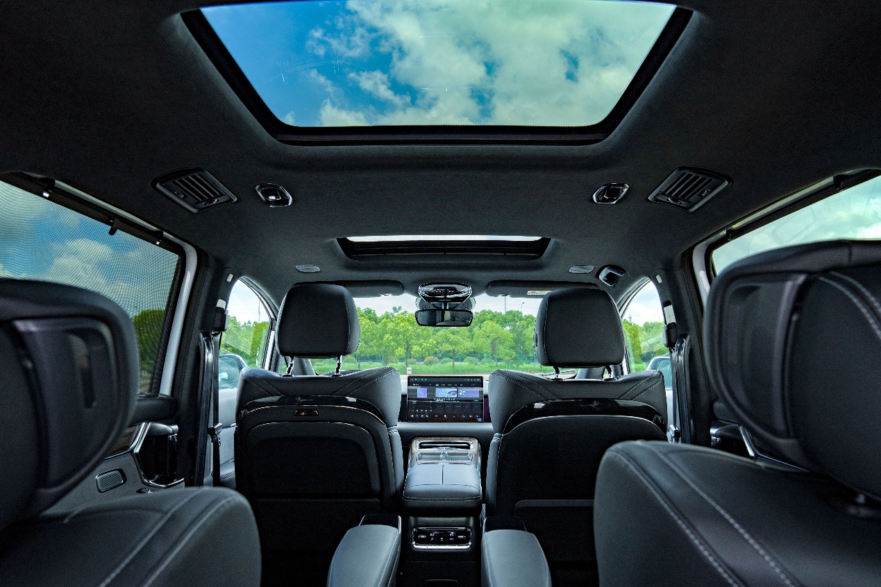 与燃油埃尔法不同,纯电动平台为合创V09带来了大不一样的座舱空间,做到了同级最大和利用率最高。例如内部垂向空间达1301mm,8岁小孩站立没问题,舱内前后空间2834mm,不仅力求“使用面积”做到最大,还要做到"公摊面积”相对最小。第三排座椅落座可翘腿,还可完全放平,在二排座椅移至最前位置后,形成长1800mm的纯平空间,可铺1800*1000mm的床垫,让车郊游露营时变身移动的家。