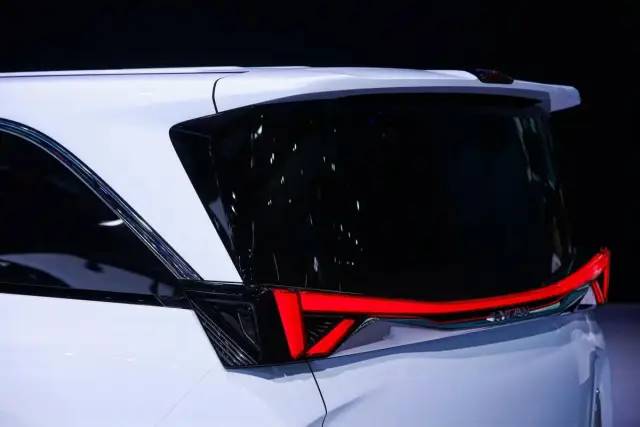 合创V09尾部设计与前脸相呼应,更显“电味十足”,贯穿式熏黑尾灯,两端微微挑起,充满未来感。最上方与埃尔法一样,提供了运动化扰流板,尾门大面积留白,增加了简洁的高级美感。