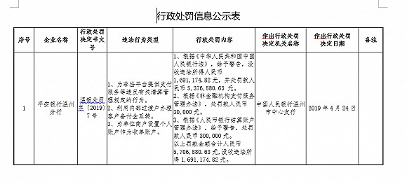 【经东网财经】央行温州市中心支行近日公开的一张行政处罚单显示,平安银行温州分行因存在3项支付违规事项被处以罚款570.7万,没收违法所得169.1万,罚没金额合计739.8万。