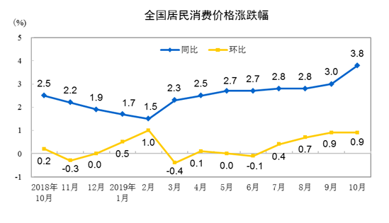 2019年10月份,全国居民消费价格同比上涨3.8%。其中,城市上涨3.5%,农村上涨4.6%;食品价格上涨15.5%,非食品价格上涨0.9%;消费品价格上涨5.2%,服务价格上涨1.4%。1—10月平均,全国居民消费价格比去年同期上涨2.6%。