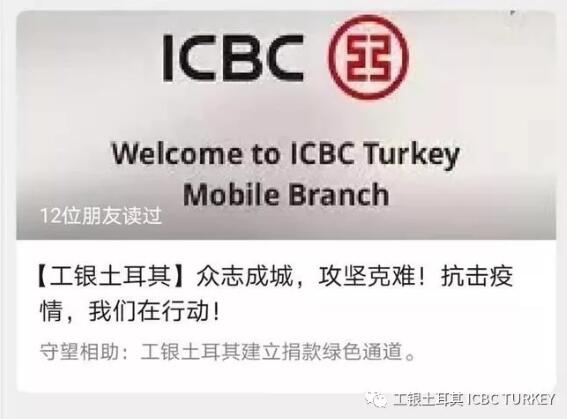 上下同欲者胜,同舟共济者赢。2月10日,在总行发出致全行员工倡议书后,工银土耳其迅速响应,将倡议书译为土耳其语发布全行,积极开展“中土心连心,工行一家亲;抗击疫情,中国必胜!”捐款活动。这是一场没有任何仪式的捐款,这是一场不需要任何动员的捐款,这是一场风雨同心、全员参与的捐款。一颗颗为抗击疫情做贡献的爱心在全体员工中迸发,不分国别、不论职务、无论姓名,每一名员工都争先恐后、主动捐款,一股强大的正能量在子行全体员工中激荡。截至2月14日,子行共收到524名员工捐款8.32万元人民币。捐款将驰援防控疫情一线,为打赢疫情阻击战贡献工银土耳其人的绵薄之力!