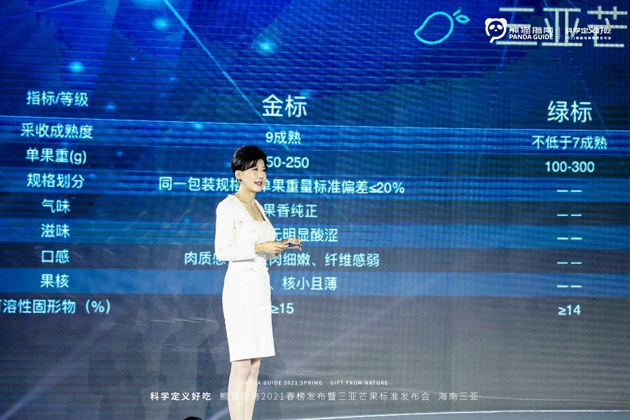 如2021春榜中,熊猫指南携手三亚市芒果协会,以三亚芒果理化数据和感官分析数据为基础建立的芒果团体标准。制定标准阶段,熊猫数据调研了消费者对鲜食芒果的需求,通过对来自31个省市自治区的1068名消费者的调查问卷,用数据勾勒出了消费者心目中理想芒果的样子,基于反馈制定标准。这将推动消费者权利进一步得到保障,同时,打通消费者与生产者之间的信息鸿沟。