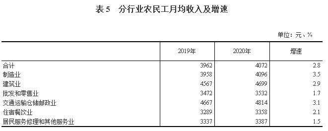 分行业看,农民工就业集中的六大主要行业月均收入继续增长。其中,从事制造业农民工月均收入4096元,比上年增加138元,增长3.5%;从事交通运输仓储和邮政业农民工月均收入4814元,比上年增加147元,增长3.1%;从事建筑业农民工月均收入4699元,比上年增加132元,增长2.9%;从事住宿餐饮业农民工月均收入3358元,比上年增加69元,增长2.1%;从事批发和零售业农民工月均收入3532元,比上年增加60元,增长1.7%;从事居民服务修理和其他服务业农民工月均收入3387元,比上年增加50元,增长1.5%。