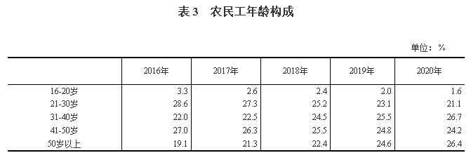 农民工平均年龄为41.4岁,比上年提高0.6岁。从年龄结构看,40岁及以下农民工所占比重为49.4%,比上年下降1.2个百分点;50岁以上农民工所占比重为26.4%,比上年提高1.8个百分点,占比继续提高。从农民工的就业地看,本地农民工平均年龄46.1岁,其中40岁及以下所占比重为32.9%,50岁以上所占比重为38.1%;外出农民工平均年龄为36.6岁,其中40岁及以下所占比重为66.8%,50岁以上所占比重为14.2%。
