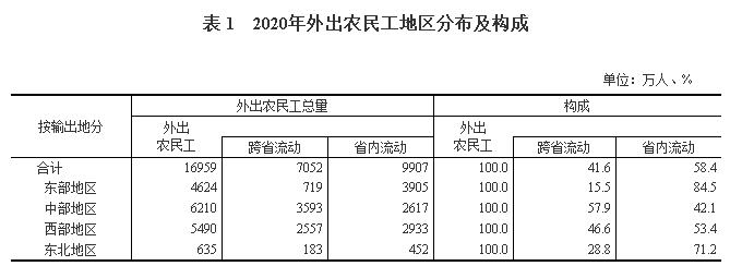 在外出农民工中,跨省流动农民工7052万人,比上年减少456万人,下降6.1%;在省内就业的外出农民工9907万人,比上年减少10万人,与上年基本持平。省内就业农民工占外出农民工的比重为58.4%,比上年提高1.5个百分点。分区域看,东部、中部、西部和东北地区省内就业农民工占外出农民工的比重分别比上年提高1.6、1.3、1.8和1.0个百分点。