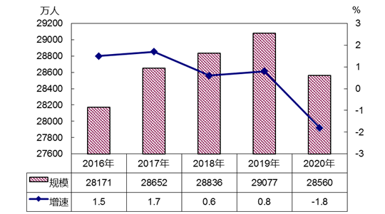 2020年,各地区各部门坚决贯彻党中央决策部署,统筹疫情防控和经济社会发展,有序推进复工复产,扎实做好“六稳”工作,全面落实“六保”任务,各项稳就业政策不断落实落地,国民经济持续稳定恢复,农民工就业保持总体稳定。2020年全国农民工总量28560万人,比上年减少517万人,下降1.8%,规模为上年的98.2%。其中,外出农民工16959万人,比上年减少466万人,下降2.7%;本地农民工11601万人,比上年减少51万人,下降0.4%。在外出农民工中,年末在城镇居住的进城农民工13101万人,比上年减少399万人,下降3.0%。