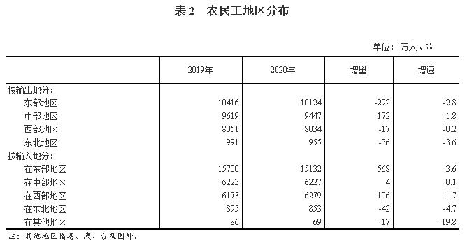 从输入地看,在东部地区就业的农民工15132万人,比上年减少568万人,下降3.6%,占农民工总量的53%。其中,在京津冀地区就业的农民工2076万人,比上年减少132万人,下降6.0%;在江浙沪地区就业的农民工5179万人,比上年减少212万人,下降3.9%;在珠三角地区就业的农民工4223万人,比上年减少195万人,下降4.4%。在中部地区就业农民工6227万人,比上年增加4万人,与上年基本持平,占农民工总量的21.8%。在西部地区就业农民工6279万人,比上年增加106万人,增长1.7%,占农民工总量的22.0%。在东北地区就业农民工853万人,比上年减少42万人,下降4.7%,占农民工总量的3.0%。