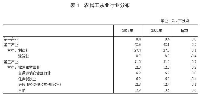 从事第三产业的农民工比重为51.5%,比上年提高0.5个百分点。其中,从事批发和零售业的农民工比重为12.2%,比上年提高0.2个百分点;从事住宿餐饮业的农民工比重均为6.5%,下降0.4个百分点。在第三产业其他行业中,从事卫生和社会工作,公共管理、社会保障和社会组织的比重有所增加。从事第二产业的农民工比重为48.1%,比上年下降0.5个百分点。其中,从事制造业的农民工比重为27.3%,比上年下降0.1个百分点;从事建筑业的农民工比重为18.3%,下降0.4个百分点。
