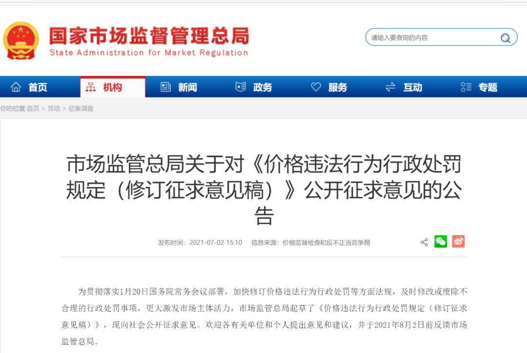【经东网财经】国家市场监管总局在7月2日发布《价格违法行为行政处罚规定(修订征求意见稿)》(以下简称《征求意见稿》)。