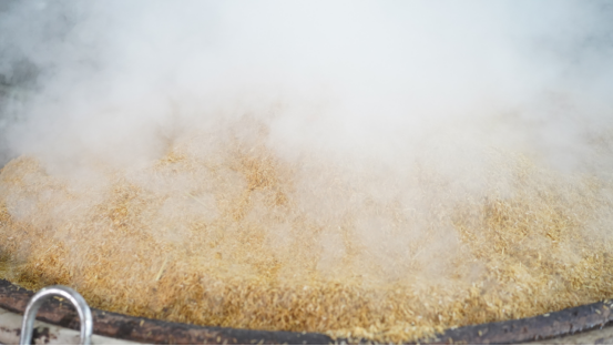 众所周知,酱酒工艺重在“高温制曲”。因此,随着曲坯的发酵,发酵仓的室内温度常常高达40℃,大民族酒的制曲工人要在较为凉爽的时段抓紧进仓翻曲,通过闻香、看色,观察大曲发酵情况。一位制曲工人介绍:“天气炎热的情况下,微生物生长繁殖尤其快,‘翻曲’能促使整个曲房中的大曲块成熟得更加均匀。”