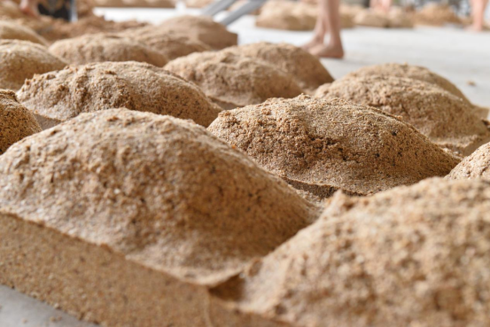 另外,为了使酒曲中的的微生物、酶系、风味逐步趋于成品曲特征,待仓内发酵期结束,要将曲块与稻草分离,拆曲后转入干曲仓堆放贮存6个月。最后方能磨曲进入制酒生产环节。
