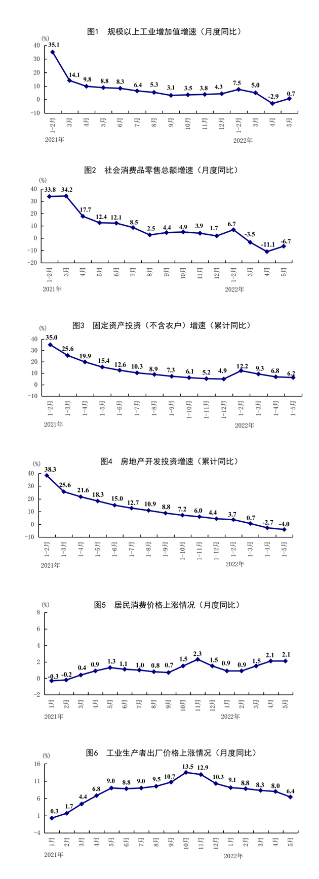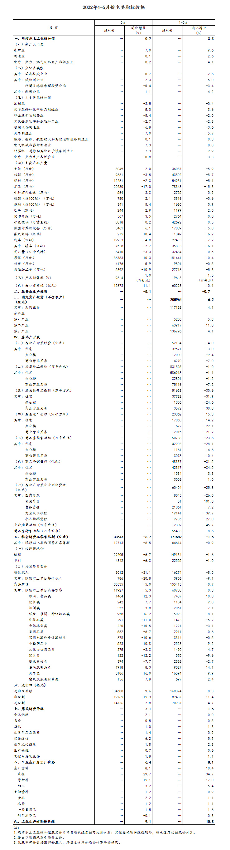 5月份,面对复杂严峻的国际环境和国内疫情带来的严重冲击,在以习近平同志为核心的党中央坚强领导下,各地区各部门高效统筹疫情防控和经济社会发展,着力稳定宏观经济大盘,国内疫情防控形势总体向好,生产需求逐步恢复,就业物价总体稳定,主要指标边际改善,国民经济呈现恢复势头。