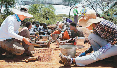 中肯旧石器联合考古项目数年耕耘 探索现代人起源中肯旧石器联合考古队中方现场负责人赵清坡(左一)和肯方工作人员在博高利亚湖遗址发掘现场工作。 考古队员在进行野外调查。 (本文配图均由作者提供) 在考古领域,旧石器时代是人类起源、扩散十分重要的阶段,而位于东非的肯尼亚境内出土了人类起源、演化过程中不同时期