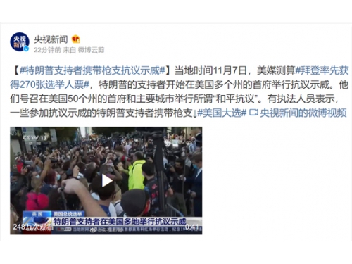 【#特朗普支持者携带枪支抗议示威#】当地时间11月7日,美媒测算#拜登率先获得270张选