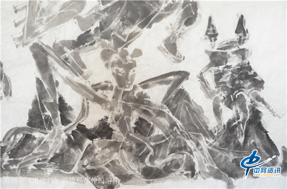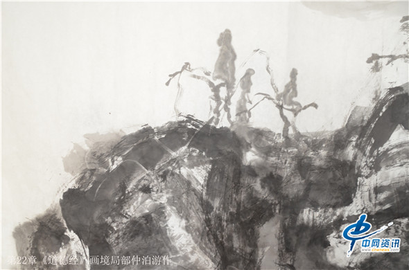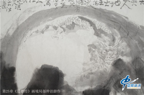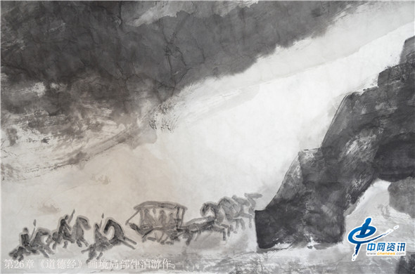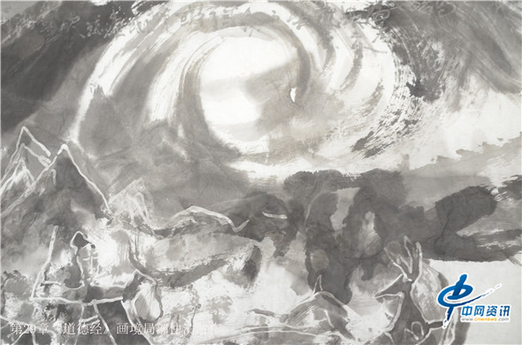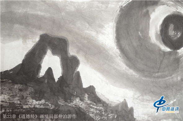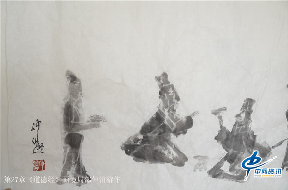 那么,通过画笔把《道德经》给展现出来又是何种景象呢?在北京的一间书画工作室,记者看到了近200米长的大型画作八十一幅老子《道德经》画境系列作品,它的作者是知名画家仲泊游。与其聊起这些作品,仲泊游表示,他自八十年代就研读老子《道德经》并把此书当做从事艺术创作的“大画论”座右铭,经过数年探寻、多年构思,现在终于把《道德经》以画作形式呈现出来。这批作品画幅宏大,水墨淋漓,宇宙山水,神秘之境,体现了远古的哲人对天地宏宇的探寻之境。阐述了画家对经典的解读,以及用画笔诠释了老子的经典意境。