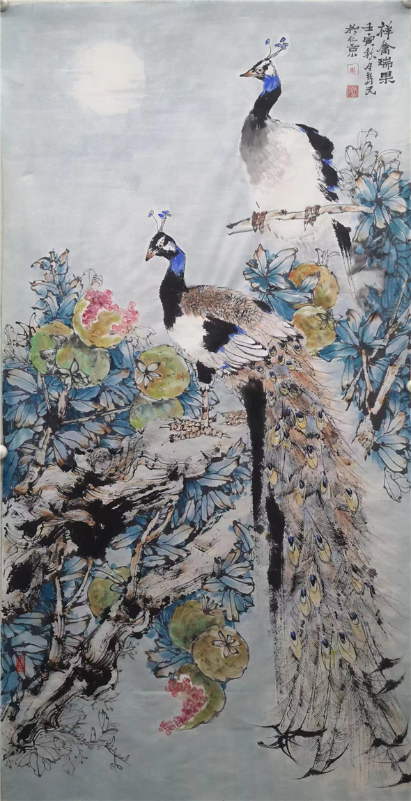 一为形神兼备。其笔下之鸟雀皆生动传神,树木及花果皆刻画细致,而其配景则寥寥几笔,形成虚实对比之画境。有远观之怡人气势,更有近观之动人细节。此形态之把握,非一日之功也,须长期、专业之造形训练方能熟捻于心。其受余昌宇先生之指导,格物并以致志,经多年之摹写,造就如今心手相畅之境界,当随喜赞叹。