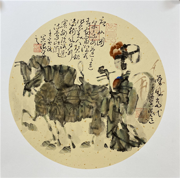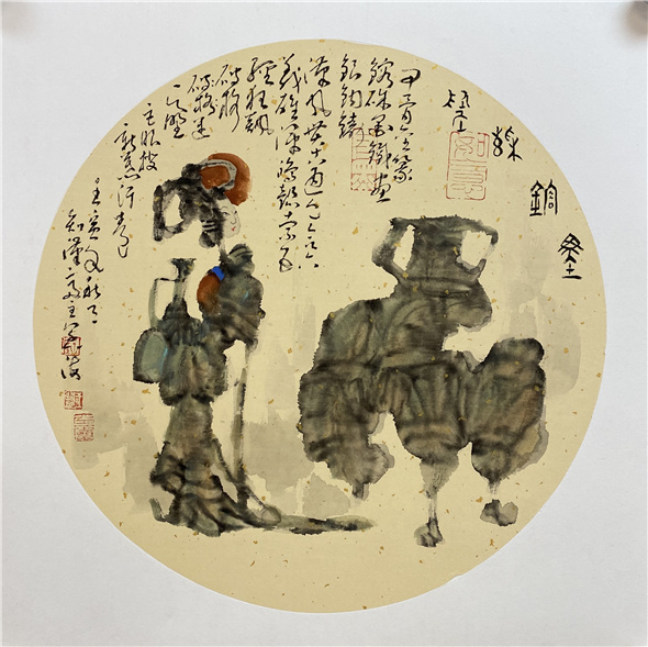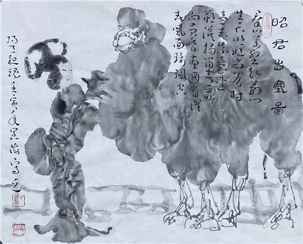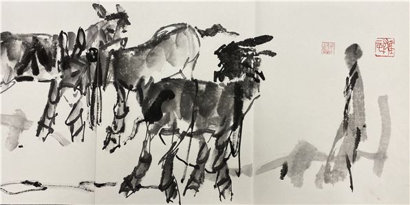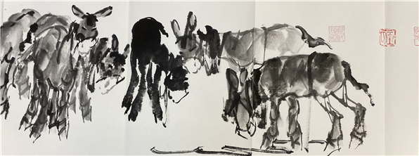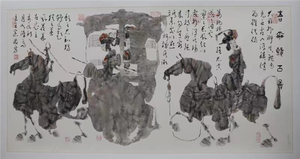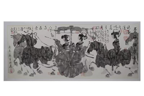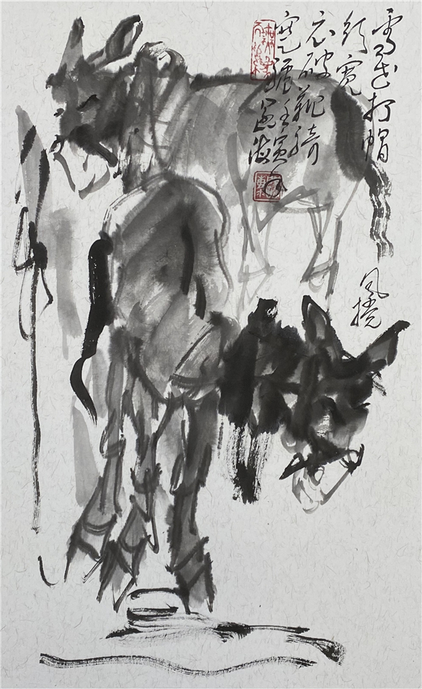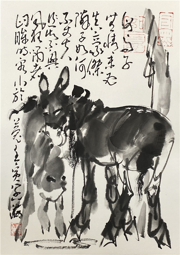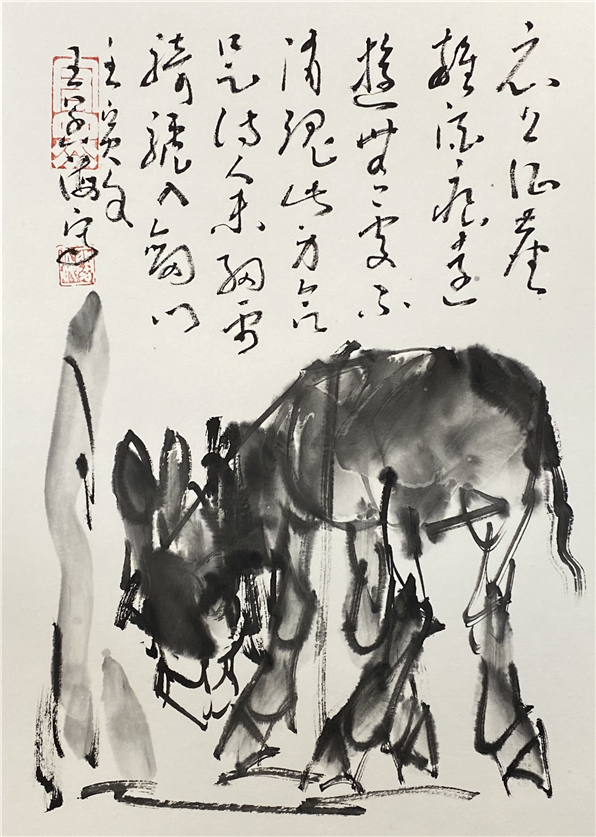 在这一思想指导之下,王阔海先生在不同题材上进行了一系列的创作,诸如近几年创作的汉化石像人物系列,毛驴系列,马、牛、羊、骆驼、老虎系列等等,这也是汉画石像中常见的题材。其作品既有勾线也有造型,融进了汉画石像石刻的正大气象,和文人画的笔墨韵味,从而形成了自己的风格式样。按王阔海先生的话说,也只有按自己的理解去画画,坚持文人画诗、书、画、印四者并举的修行路线前行,而不是人云亦云,才能创作出属于自己风格的中国画。