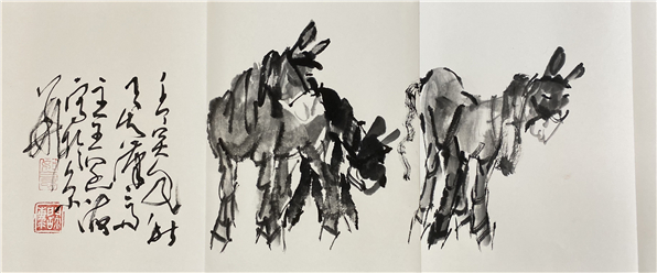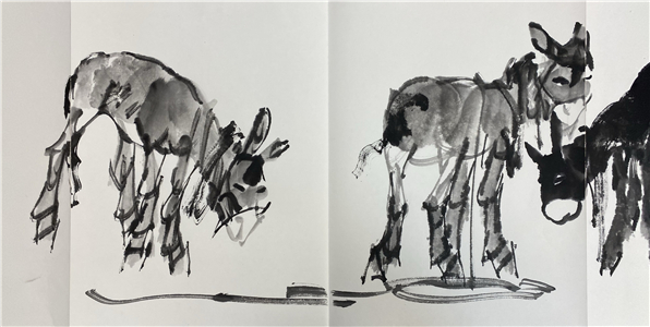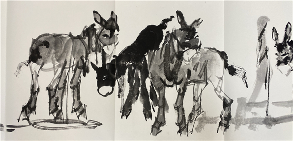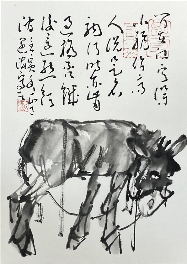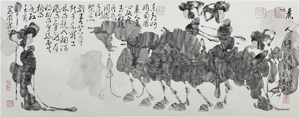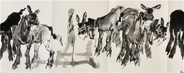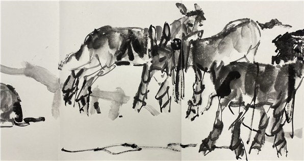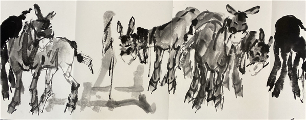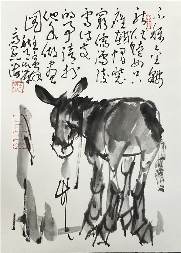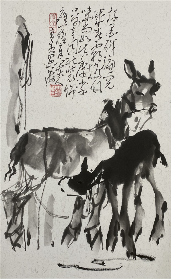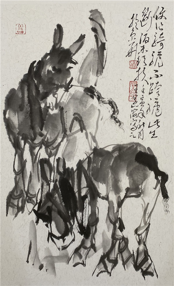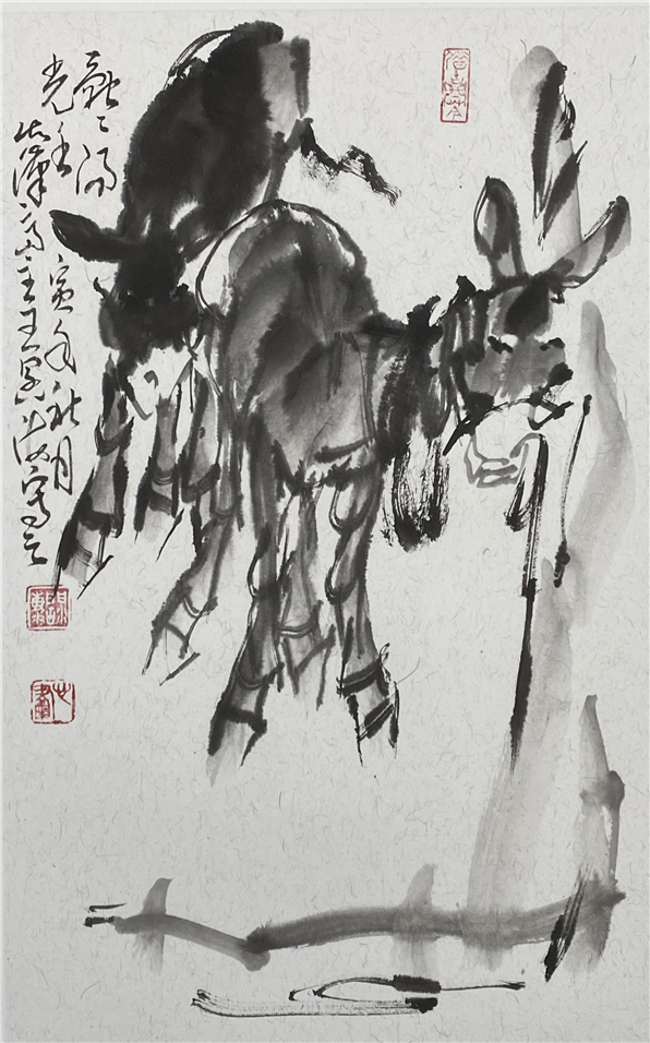 近几年王阔海先生画的驴、马、牛、骆驼、羊、老虎等动物系列,更足见其高超的造型能力和独到的极尽其妙的笔墨施展,达到了陈子庄所评价徐谓的画“乱而不乱”的境界。加之写意画之书法用笔和书法题字达到了当今少有的文人画高度,实现了对以往画驴,画马、画牛、画骆驼、画羊、画虎的突破,显示出王阔海先生的中国画素描对于中国画笔墨表现的重要性和王阔海先生对中国画笔墨、水墨之深入的理解,着实让人叹为观止。