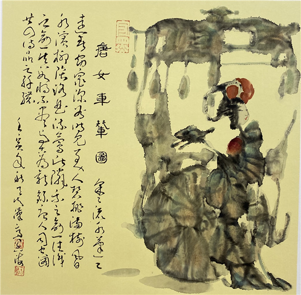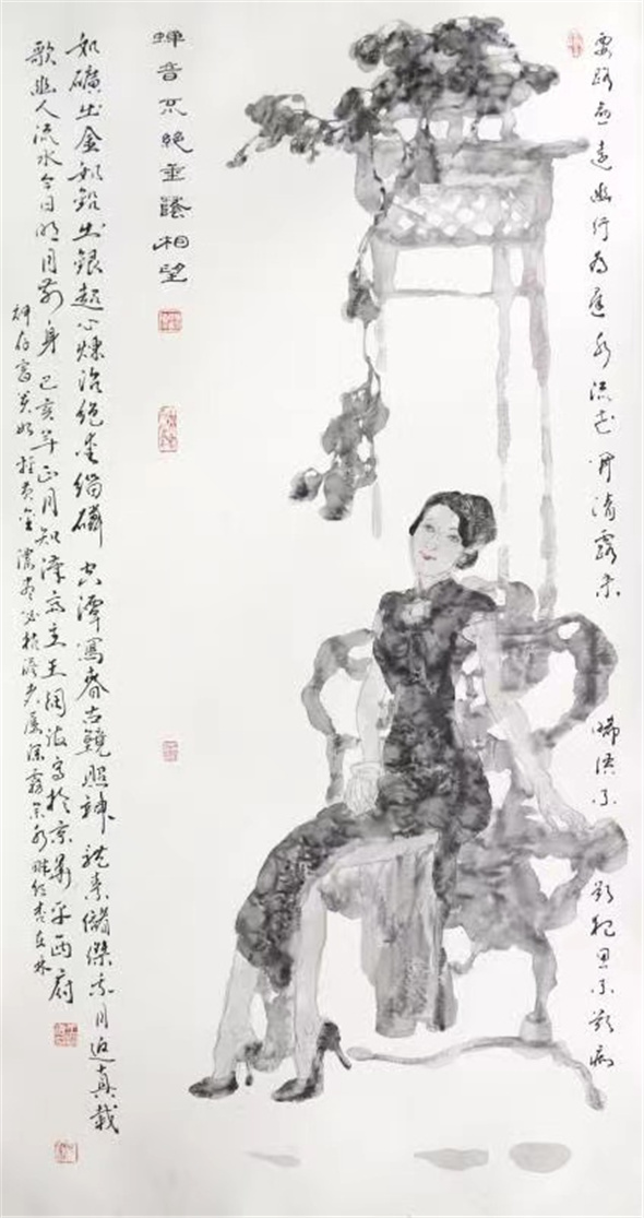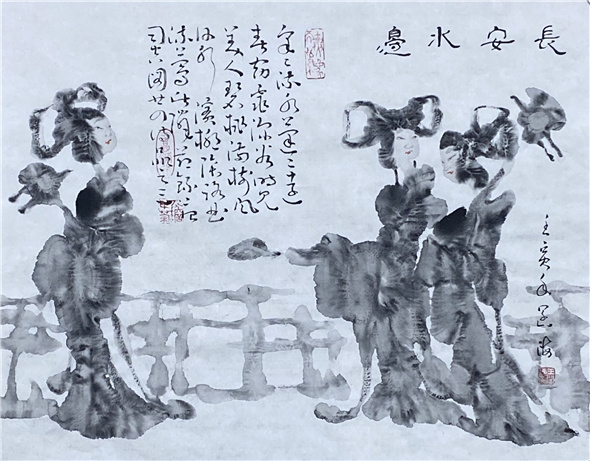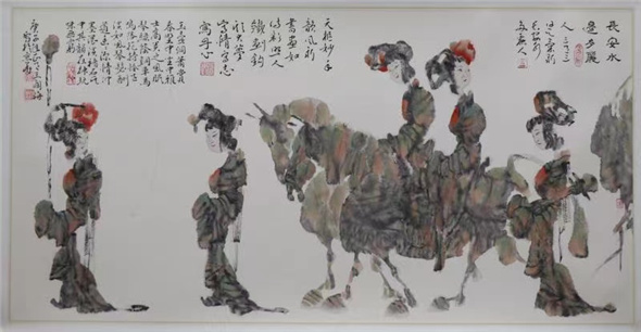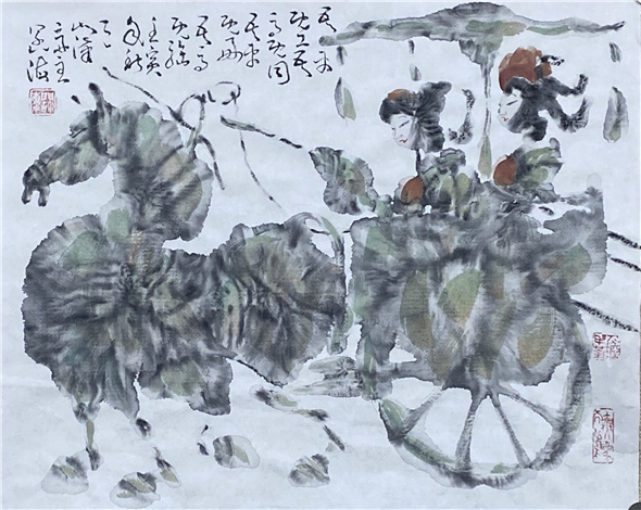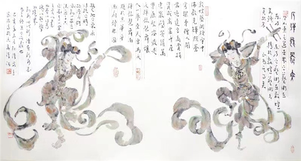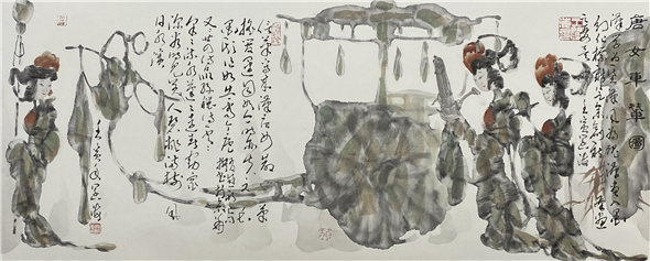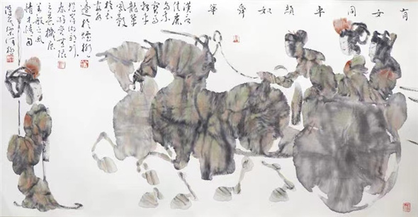 如此美妙的诗句,悠闲地同车漫游,与图中丽人挽手同行的浪漫之旅——这便是王阔海先生创造的清新雅致、美丽浪漫、飘逸洒脱、灵动神奇、超然玄妙的新汉画世界!