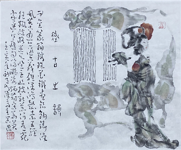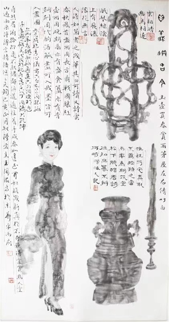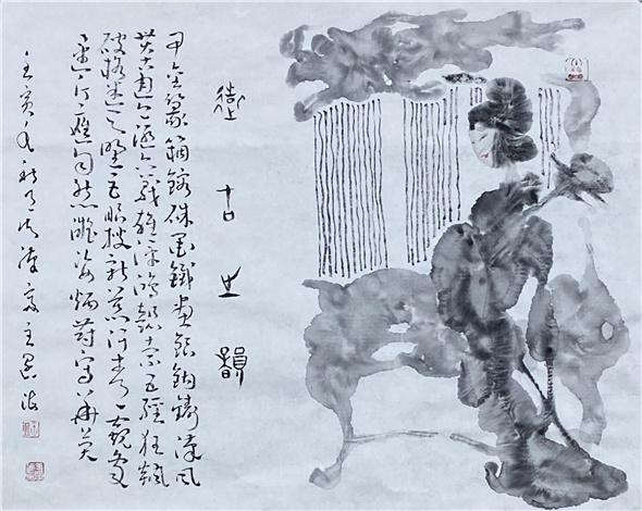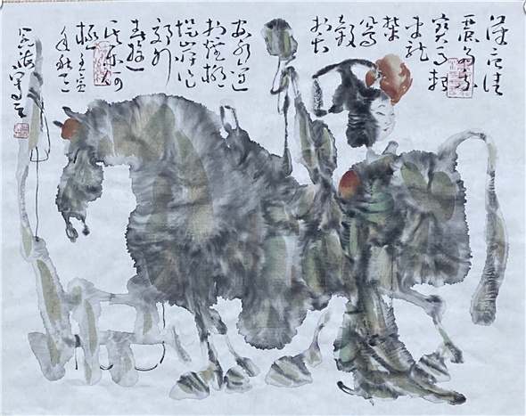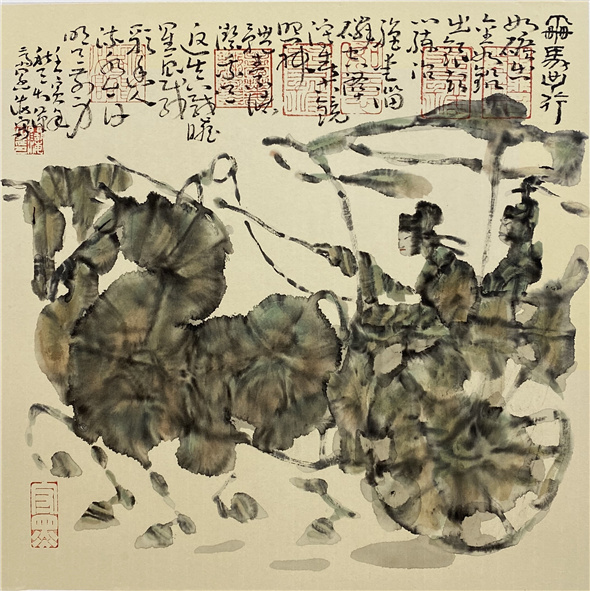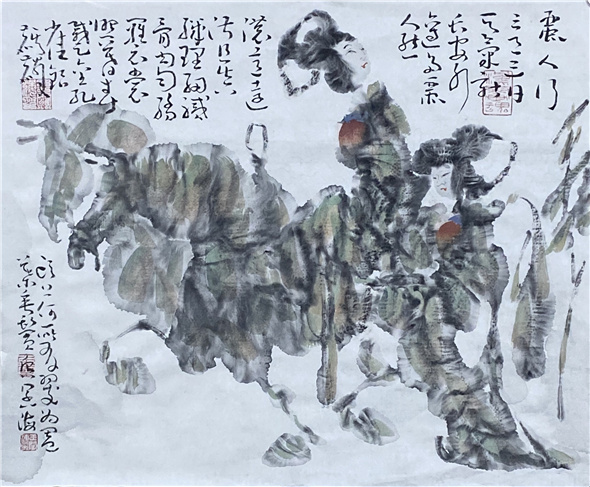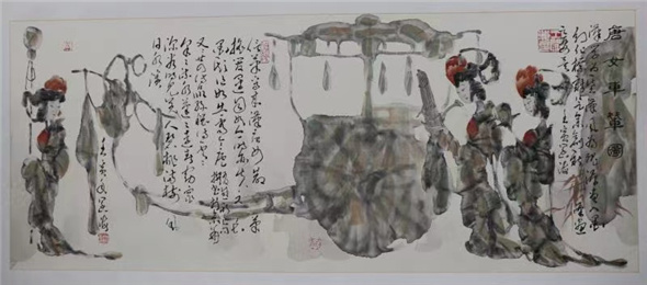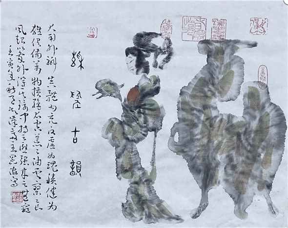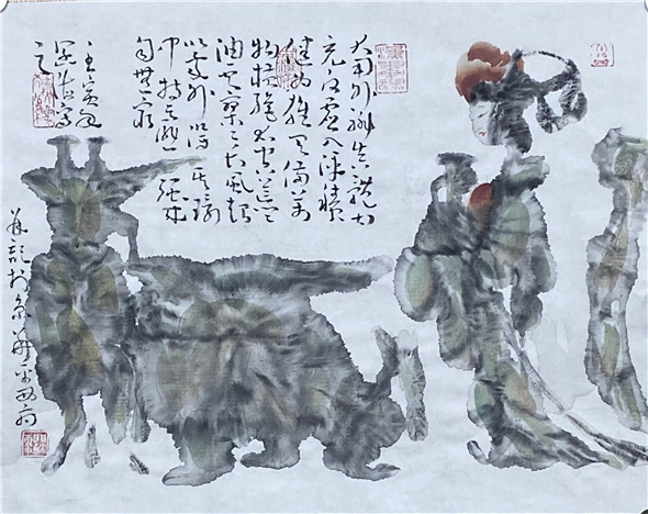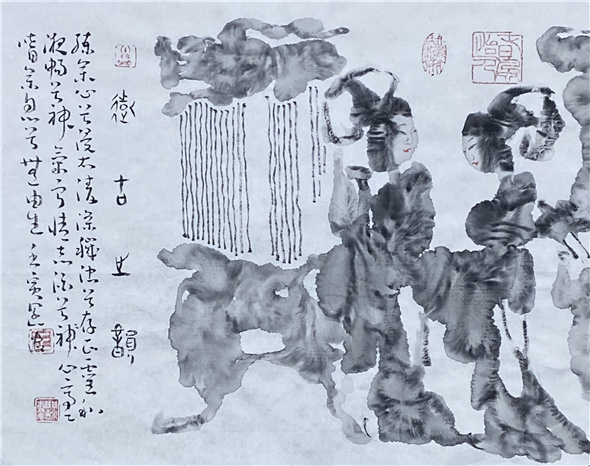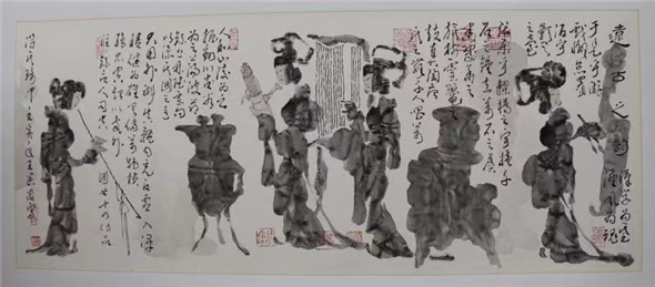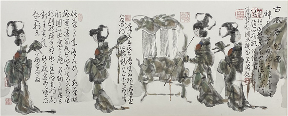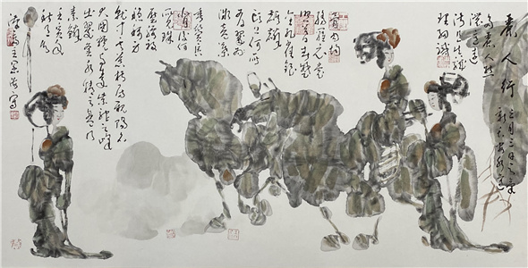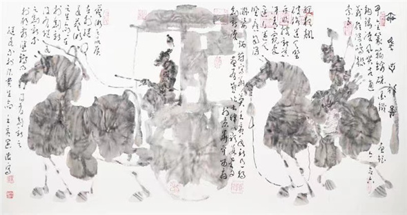 我们借此来欣赏王阔海先生几幅新汉画代表作品。诸如《春耕图》,这是一幅参照四川汉化石刻拓片,进行的再创造。《吾车既工好游》,也是根据汉画像石刻,由石刻形态变成水墨形态。再是《丽人行》,用了同样的手法。这几幅作品,除了各具风格和内涵之外,它们有一个共同的特点,就是在原图表达内容不变的情况下,充分运用中国画的笔墨处理,将没骨画法开辟了一个新的领域;由原来刀刻斧凿的痕迹变为笔线和墨色的相互渗透,将“心性、水性、墨性、色性、纸性、笔性”六性合一,一气呵成,筋骨血肉浑然一体,从而人为的痕迹消失殆尽,而呈现为笔墨的深层次意味,将汉画像石刻拓片之死墨变成了活墨。板结变为灵动。由刻露变为温润。笔清墨爽、淡雅闲适、松活飘逸、画意盎然!尤其是画面的题跋,锦上添花、异彩纷呈,与画中内容既交相辉映又融为一个整体,成为画面不可分割的一部分,展示出王阔海先生高深的笔墨功夫和书法功力。即便是把其中的题跋独立出来,也是一幅精彩绝伦的书法作品。更因题跋与人物珠联璧合,一种神奇、玄妙的笔墨效果氤氲其间,给人一种妙然天成、神乎其神的审美感受,仿佛汉代的人物场景,经过笔墨的转换之后活龙活现于读者眼前,令人不由自主地跟着画面上的主人,一起向往晴耕雨读的田园生活,或是不由自主的默默吟唱: