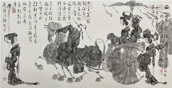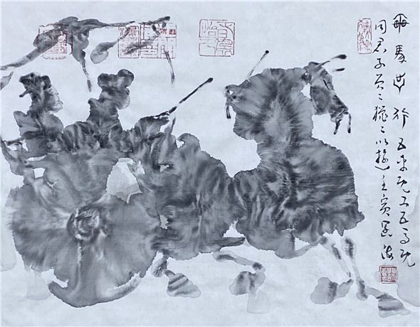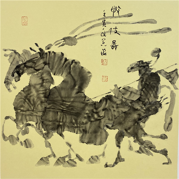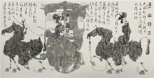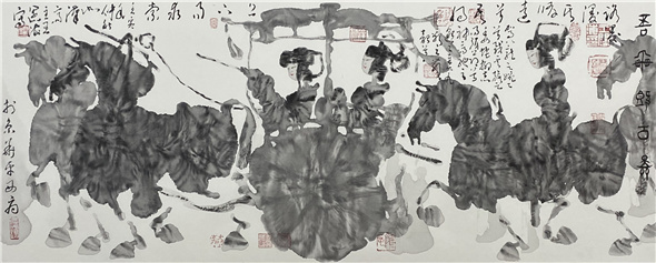 而王阔海先生另一种取法的高度就是将汉画像石刻形态转换成水墨形态,以笔代刀。更将汉画像石刻拓片之死墨,平墨、板墨变成了看似流动的,色墨互相冲撞融合幻化的活的新汉画水墨艺术形式,被中国美术史论家刘曦林先生称之为“新水墨的奇迹”。