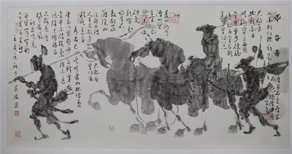 比如被中国美术馆收藏并获全国大奖的宏幅巨制《飞夺泸定桥》,就是一幅由王阔海先生所独创的新汉画水墨技法与中国画素描造型相结合的中国画笔墨造像的典型代表作品。其作品打破了以往勾线填色的笔墨造型常规,而是运用了全新的暗含之线、暗含之骨、暗含之笔的——新汉画没骨水墨之法,在浓、淡、干、湿、焦黑的相冲相化中,极为自然的将中国画素描四要素融入其中,而且是悄无声息,神遇迹化般的融合,使红军人物形象造形如钢铁之坚,敲之有声。使观者沉浸在神秘的笔墨交融幻化的玄妙意韵之中,从而打破了以往重大题材讲素描造型而丢了笔墨的窘境,达到了素描造型与中国画笔墨自由精神的高度统一、高度协调的境界。