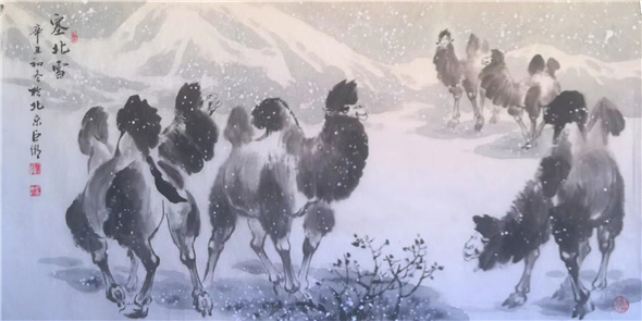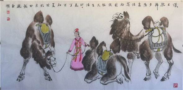 明代诗人王恭曾有诗叹曰:“张掖何人独冠军”“甘州风物更谁亲”。而今我们不妨从巨潮先生的作品中寻找答案。他的动物画以其独到的艺术语言、精湛的绘画技艺、特有的表现手法、强烈的个人风貌立于当代画坛,得到了众多评论家、收藏家的关注和喜爱,作品先后被民族文化宫、荣宝斋、加拿大多伦多博物馆等海内外艺术殿堂机构及个人收藏,去年被国家版权局授予“没骨泼彩动物画创始人”。读者也许会由此联想到许多大师们的动物画:李可染画牛,齐白石画虾,黄胄画驴,徐悲鸿画马·····这些美术界的前贤都从动物画中找到了创作的奥妙和灵感,成为一代宗师。巨潮目前虽然不能与前辈大师们比肩,但他笔下那些高贵典雅意蕴丰厚的动物形象与他的水墨人物,已成为一种对照和互映。毫无疑问,没骨泼彩的骆驼梅花鹿,已然是他艺术符号的另一种诠释。我相信,只要他不断地追随大师们的脚印,凭着自己的睿智勤奋和探索努力,不久的将来也一定会独领风骚,取得更大的成就。