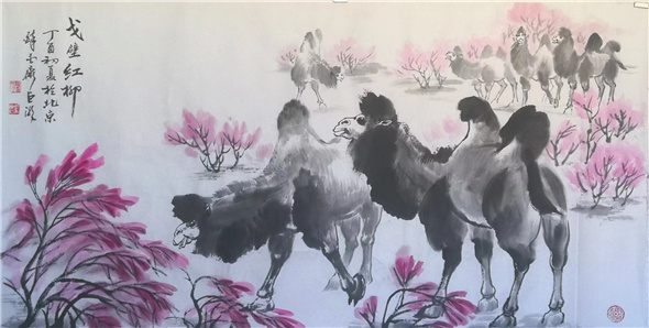 我与巨潮先生相识多年,曾有一句诗送他:巨潮涌张掖,声声动山川。他擅长水墨人物画,人物造型优美,生动传神,在许多展览中和报刊杂志上多有佳作问世,颇得业内好评。但是近些年来他笔锋一转,又独辟蹊径地画出了一大批动物画,尤以梅花鹿、骆驼见长,带给人们更多的新鲜和奇异。骆驼、梅花鹿都是河西走廊常见的动物。骆驼素有沙漠之舟的美称,在极端恶劣的自然环境中如戈壁、沙漠里不吃不喝可坚持十数天之久,具有忍饥耐劳、坚韧不拔、忍辱负重、艰苦卓绝的品格;梅花鹿体态优美,行动敏捷,性格温顺,色彩绚丽,自古以来就被人们誉为吉祥动物,象征着健康长寿,寓意着财源广进。巨潮先生常年深入驼群、鹿场画了大量写生,将梅花鹿与骆驼的生活习性结构动态研究得深入透彻,了如指掌,在画水墨动物画的基础上经过多年潜心钻研,勤奋实践,独创出了“没骨泼彩点水动物画”。他掌握了娴熟的泼彩技巧,运用独特的工具材料,水、墨色渗化交融,浑然一体,点、线、面巧妙组合,相映成趣,画面色彩斑斓,水墨淋漓,变幻无穷,妙造天然,十分生动地表现出动物皮毛的特性和质感、量感、空间感。凭着他多年的绘画历练和多方面的艺术修养,将动物画与山水画、花鸟画、人物画相结合,营造动物特定的生活环境,赋予其生动的姿态表情,将人文精神贯穿于动物画的意境之中,格调高雅,品味纯正,灵秀俊逸,意味隽永,于质朴纯厚中闪射出灼灼光华,凸显出强烈的地域特点与浓郁的时代气息,在美术百花园之中绽放出又一朵奇葩。