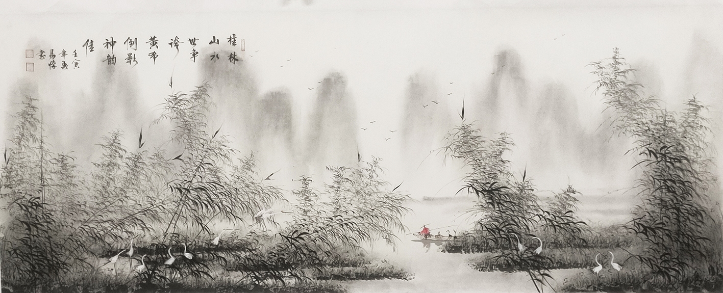 故宫博物院原副院长李季点评邓平的画作:无论是“水光潋滟”,还是“烟雨空朦”,漓江山水 ,烟云供养的水墨晕染中幻化开来。空明、温润、清虚、散逸,细腻的笔致,氤氚着淡墨的光彩,使画面焕发着清彻与空明。