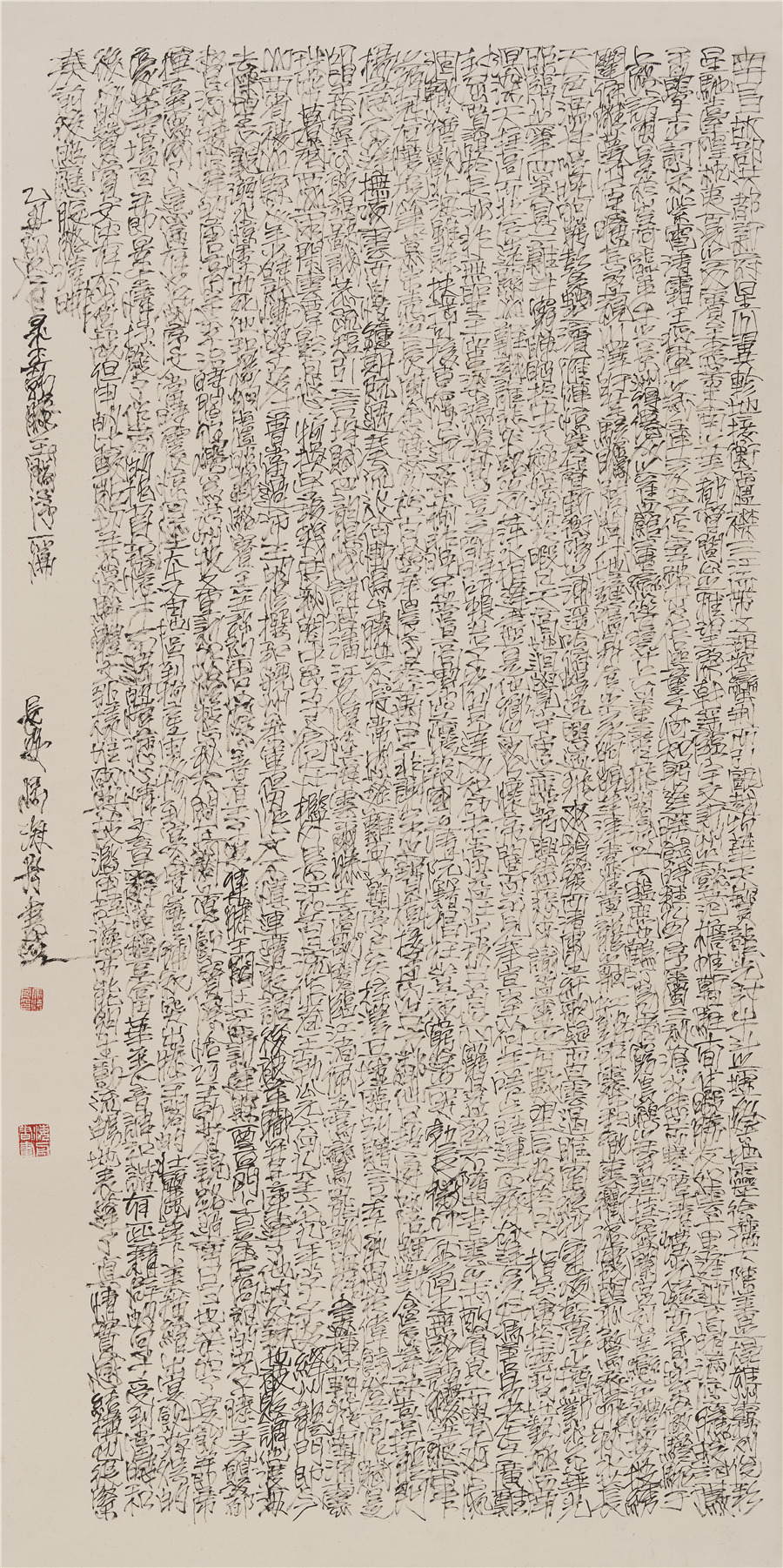 那么,对于书画艺术,我们一直在呼唤大师,而真正的大师却都不愿做金钱的奴隶,他们把艺术创作看的比什么都重。这使我突然想起了贾平凹曾经拜访马海舟之前在一篇文章中所谈到的话,他是这样来谈马海舟的,“他的情况我一概不知,我却敢断定,他是位卑而贫穷。这样的画细读起来笔笔并不敷衍和潦草,也未显出疲倦和慵懒之像,可见他是明白而又安于不通达,生命和精神都寄于画中。于是,这样的画就有了它的美学价值,有了他真实的活生生的人的存在。”在书画圈这么多年的接触中,马海舟先生能从一而终的坚持自己的艺术创作而不受世俗的影响,并能创作出大量的让人震撼的艺术作品,难能可贵,他的作品有对人生的呐喊,有对生命的礼赞,有着穿透时代的冲击力和艺术张力,这才是真正的艺术大家。(文/任柯)