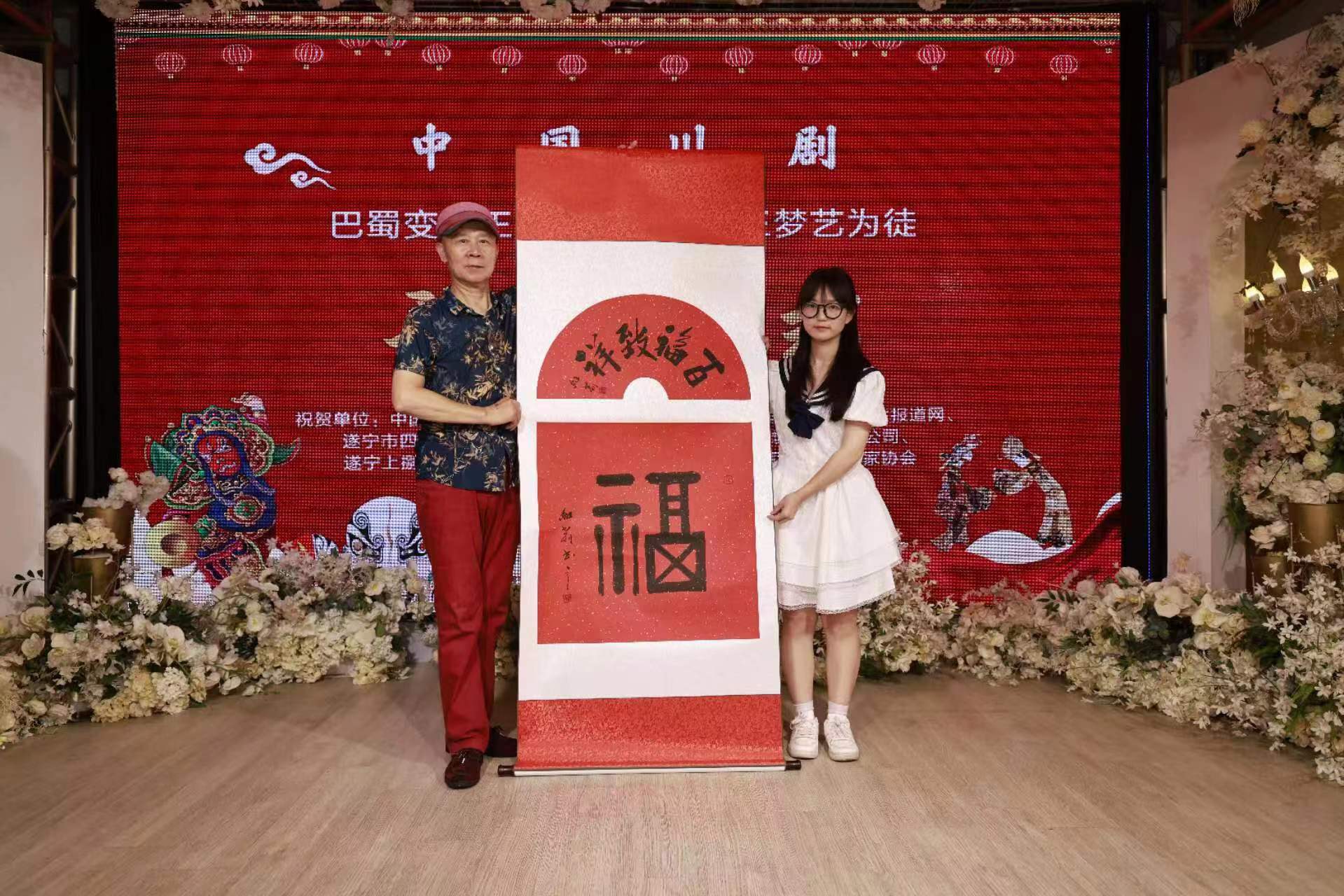 7月11日上午,川剧变脸大师龙怡策在遂宁举行隆重收徒仪式。著名画家王红莉女士自京赴川亲临见证,并送赠送书画作品以示祝贺。龙怡策、国家二级演员、中国戏剧家协会会员。