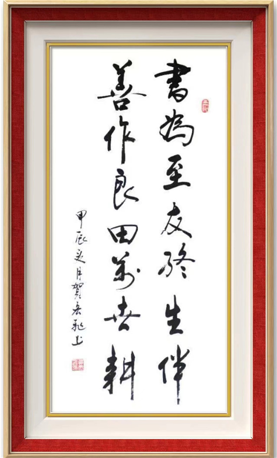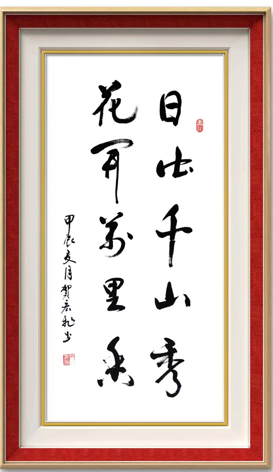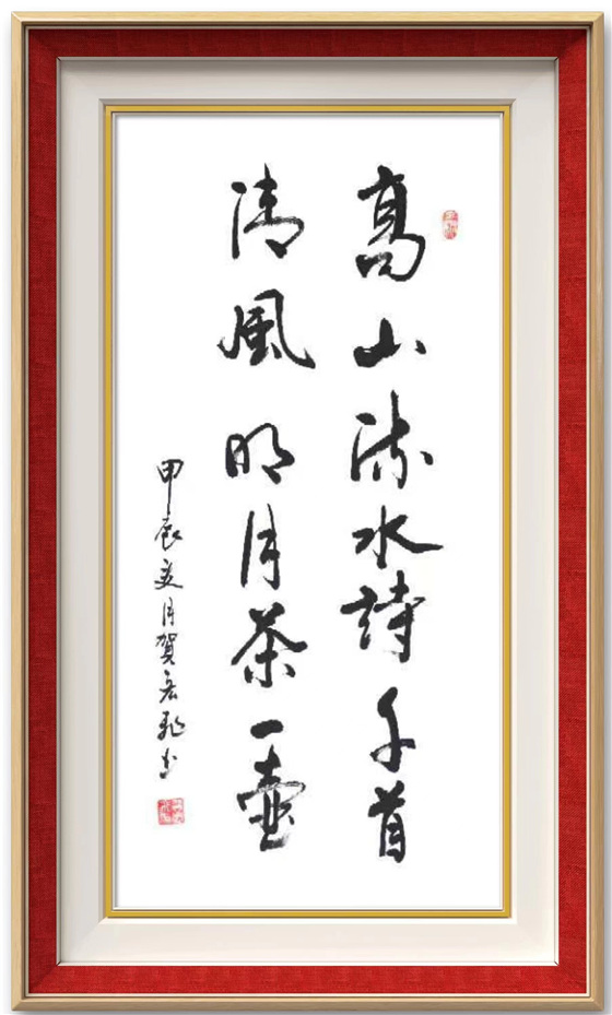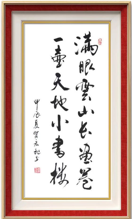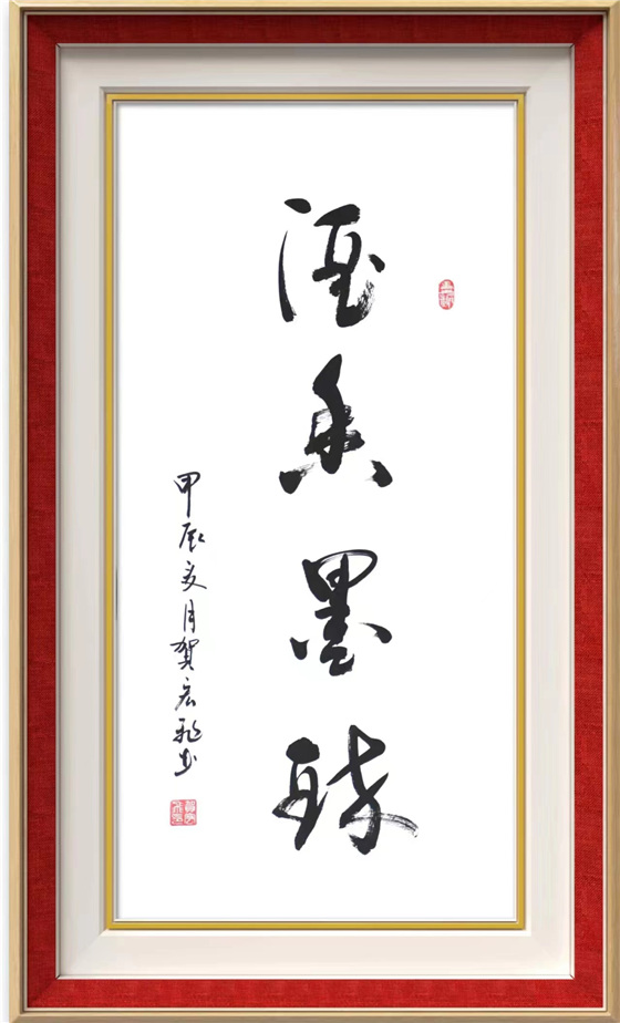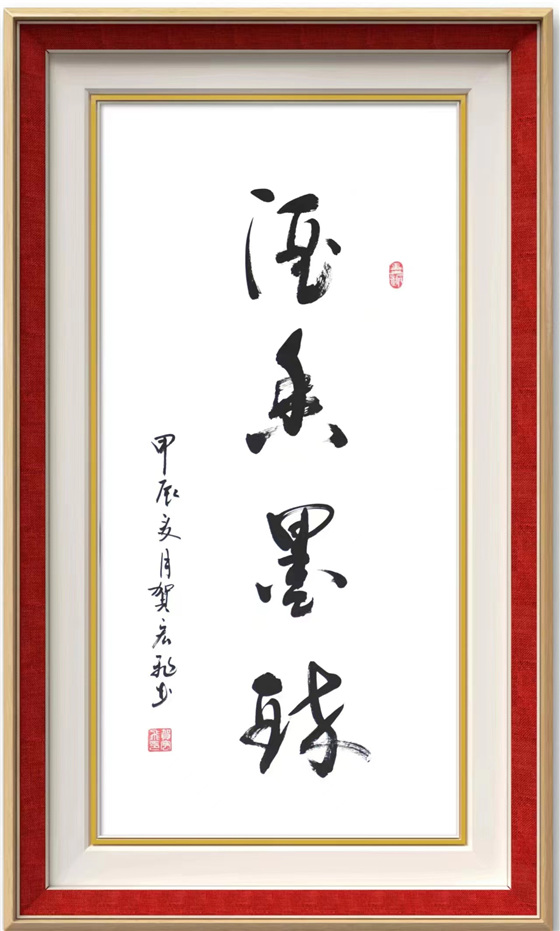 贺宏飞书法作能达到高的境界,与他长年勤奋开悟和临墨不辍分不开。他勤奋耕耘,以"二王"行草书写为长,苦于探索,在用笔结构和章法上都体现到刚柔并济,张驰有度,收放自如,有迟急、起伏、曲折之分,笔锋有正侧、藏锋之别、笔画形态有方有圆,同时,在字体比例与结构及合理章法上其表现的淋漓尽致,所以他的行草书法具备突破性,表出的气韵贯通、大气磅礴又相辅相成,具备了自已独特的艺术风格。