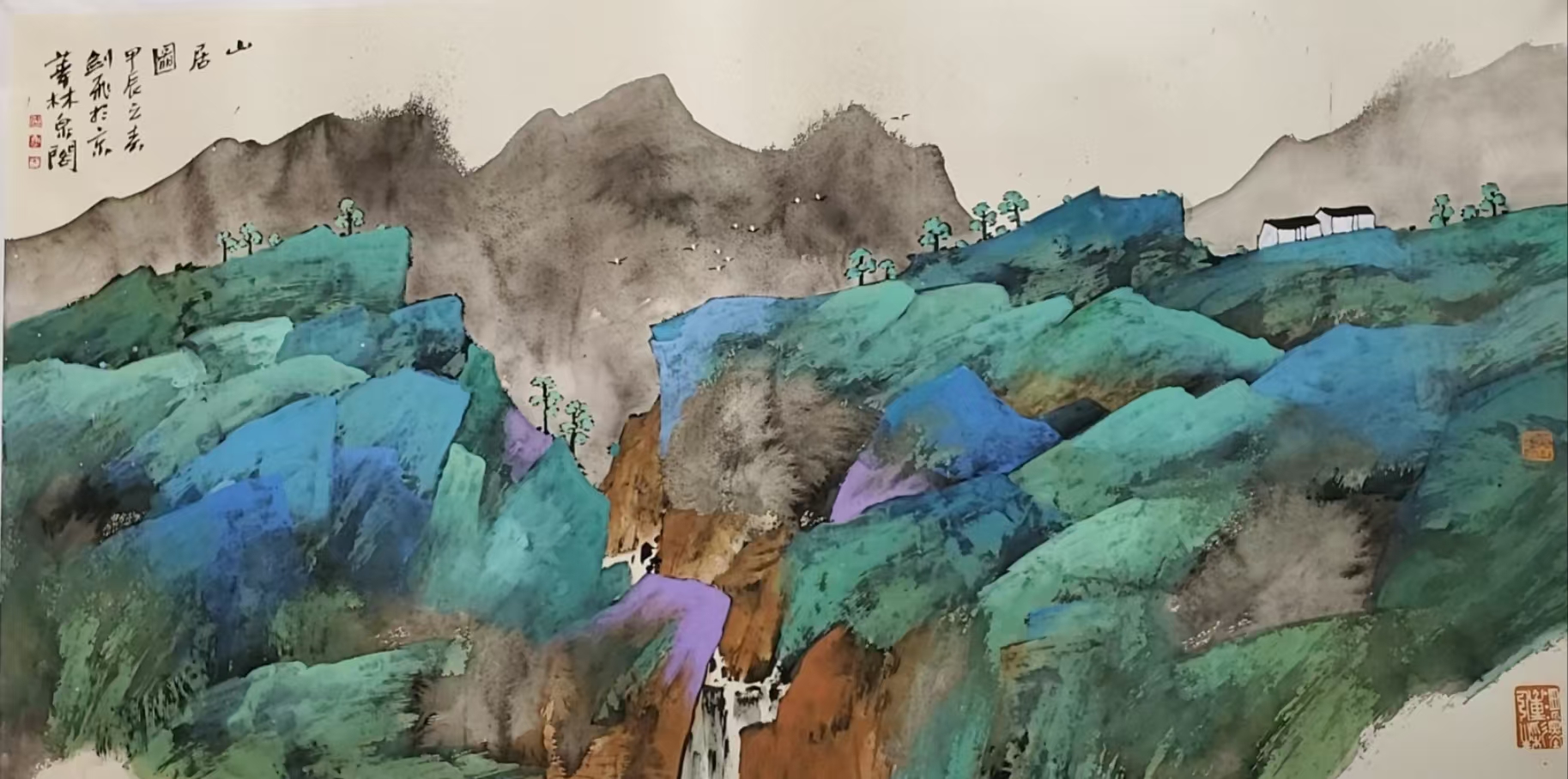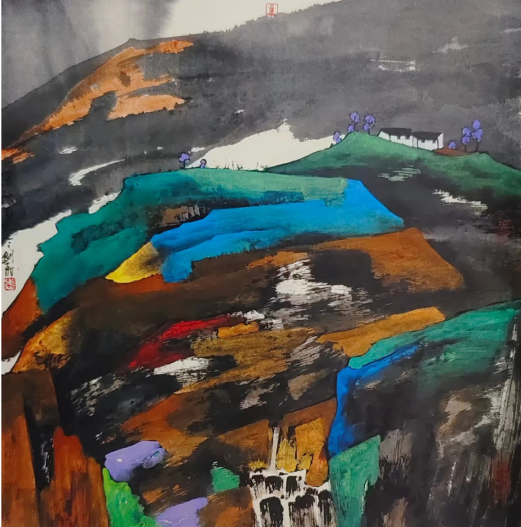 武剑飞的“积彩法”极大地拓展了中国山水画的表现空间。通过层层叠加的色彩运用,他创造出前所未有的光影效果与空间感,使画面更具立体感与厚重感,这种技法不仅提升了中国画的色彩表现力,也使得作品在视觉上更富有震撼力,他的创新打破了传统水墨画局限于单一色调的表达形式,赋予中国山水画更加多样化的表现手段,这一创新为后继艺术家提供了全新的创作思路,也让中国画在当代艺术领域展现出了更广阔的可能性。